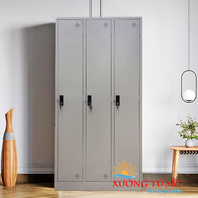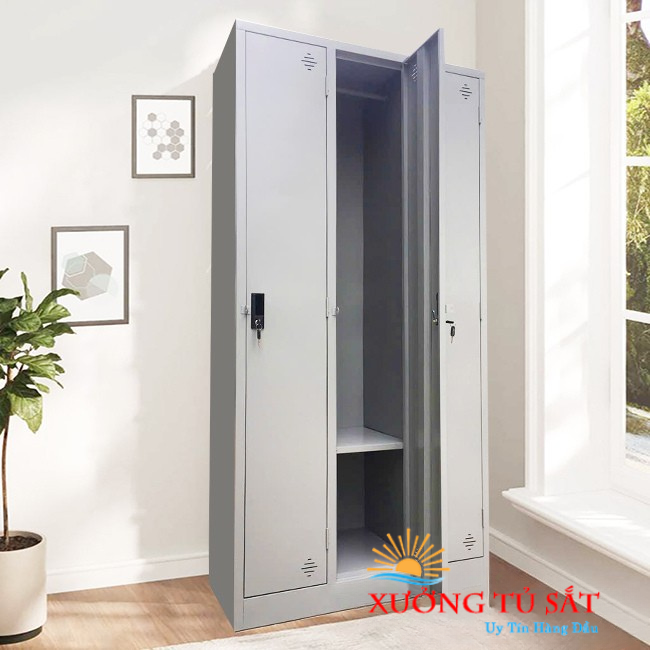 Tủ sắt đựng quần áo 3 buồng (tủ đựng quần áo 3 cánh sắt) vừa treo quần áo vừa đựng đồ cá nhân, sử dụng phổ biến tại các công ty, khu công nghiệp, nhà xưởng cho công nhân, nhân viện, hay các ký túc xá, quân đội… vv.