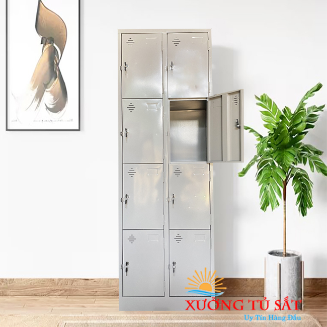 – Tủ sắt locker 8 ngăn nguyên khối, hình chữ nhật đứng, 2 cột, mỗi cột 4 ô. Cánh sắt mở mỗi ô.